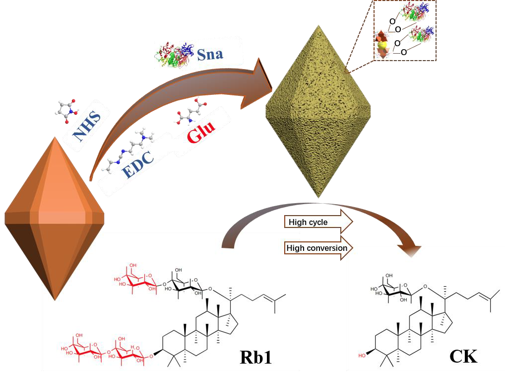 在生物催化体系构建与性能强化方面,课题组围绕酶催化过程中稳定性不足与难以重复利用等关键问题,开展了基于功能化金属有机框架材料的固定化策略研究。通过引入天然谷氨酸对铁基金属有机框架材料MIL-88B (Fe)进行表面修饰,构建新型复合载体体系,并结合共价接枝方法实现酶分子的高效固定化。该研究创新性地利用有机配体调控载体界面化学环境与空间结构,有效改善了酶分子微环境与构象稳定性,克服了传统游离酶体系在工业应用中的局限性,为稀有人参皂苷CK的绿色高效制备提供了重要技术路径。研究成果以“Immobilization of snailase on glutamate modified MIL-88B(Fe) to efficiently convert the rare ginsenoside CK with high enzyme recyclability and stability”为题发表于国际期刊《International Journal of Biological Macromolecules》(中科院一区TOP,IF 7.7),曹翠博士为第一作者,武占省教授为通讯作者,GimyTV 为通讯单位。