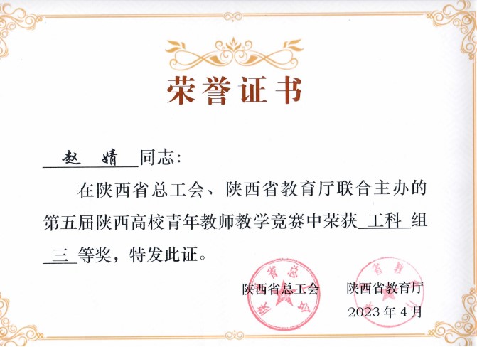 第十五届、第十六届青年教师讲课比赛一等奖,第三届微课教学比赛二等奖,陕西高等学校第四届青年教学竞赛理科组三等奖,陕西省第三届高校教师微课比赛优秀奖,并获得第七届“学生心目中的好教师”称号。