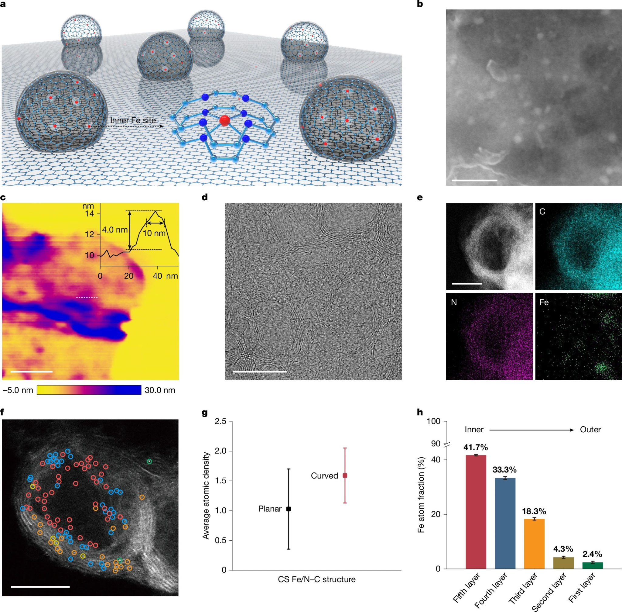 占省教授团队杨博龙副教授与北京化工大学向中华教授、深圳大学王丹教授、东南大学王金兰教授、香港城市大学刘彬教授和中国科学院过程工程研究所张锁江院士团队合作,创新性地设计并制备了一种具有中空多壳层结构的单原子铁催化剂(CS Fe/N-C),获得同时具有高活性与稳定性氢燃料电池性能。相关成果以“Acidic oxygen reduction by single-atom Fe catalysts on curved supports”为题,发表在《自然》(Nature)杂志上。